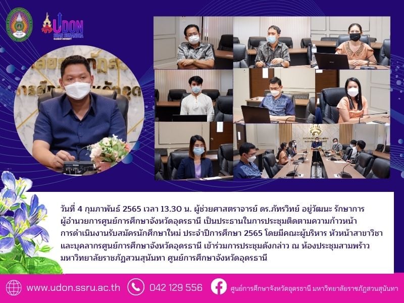 วันที่ 4 กุมภาพันธ์ 2565 เวลา 13.30 น. ผู้ช่วยศาสตราจารย์ ดร.ภัทรวิทย์ อยู่วัฒนะ รักษาการผู้อำนวยการศูนย์การศึกษาจังหวัดอุดรธานี เป็นประธานในการประชุมติดตามความก้าวหน้าการดำเนินงานรับสมัครนักศึกษาใหม่ ประจำปีการศึกษา 2565 โดยมีคณะผู้บริหาร หัวหน้าสาขาวิชา และบุคลากรศูนย์การศึกษาจังหวัดอุดรธานี เข้าร่วมการประชุมดังกล่าว ณ ห้องประชุมสามพร้าว มหาวิทยาลัยราชภัฏสวนสุนันทา ศูนย์การศึกษาจังหวัดอุดรธานี