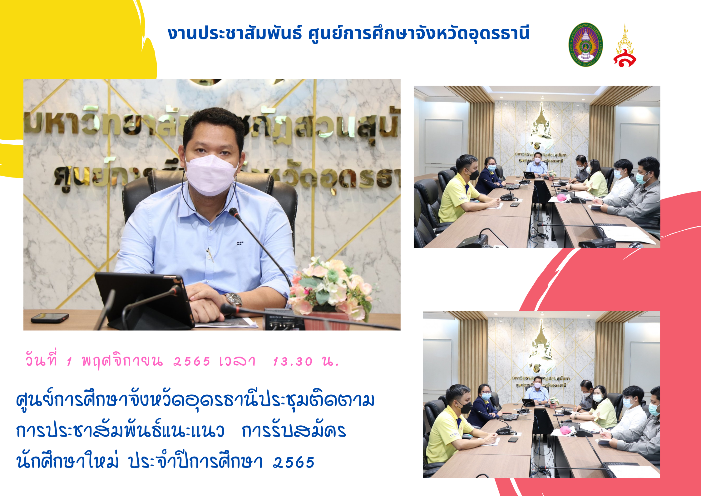 ช่วงบ่าย วันที่ 1 พฤศจิกายน 2564 ผศ.ดร.ภัทรวิทย์ อยู่วัฒนะ รักษาการผู้อำนวยการศูนย์การศึกษาจังหวัดอุดรธานี ร่วมกับผู้บริหาร และหัวหน้าสาขาวิชา ประชุมติดตามการประชาสัมพันธ์แนะแนว การรับสมัครนักศึกษาใหม่ ประจำปีการศึกษา 2565 ณ ห้องประชุมสามพร้าว ศูนย์การศึกษาจังหวัดอุดรธานี
