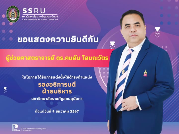 ขอแสดงความยินดีกับ ผู้ช่วยศาสตราจารย์ ดร.คมสัน โสมณวัตร ในโอกาสได้รับการแต่งตั้งให้ดำรงตำแหน่ง “รองอธิการบดีฝ่ายบริหาร” **มติที่ประชุมสภามหาวิทยาลัยราชภัฏสวนสุนันทา วาระพิเศษ ครั้งที่ 2/2567 วันที่ 9 ธันวาคม 2567