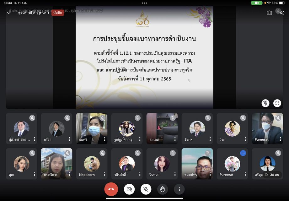 วันอังคาร ที่ 11 ตุลาคม 2565 ผู้ช่วยศาสตราจารย์ ดร.ภัทรวิทย์ อยู่วัฒนะ ผู้อำนวยการศูนย์การศึกษาจังหวัดอุดรธานี มหาวิทยาลัยราชภัฏสวนสุนันทา พร้อมด้วยนางสาวกานดา สารพล รักษาการหัวหน้าสำนักงานศูนย์การศึกษาจังหวัดอุดรธานี เข้าร่วมประชุมชี้แจงแนวทางการดำเนินงาน ตามตัวชี้วัด 1.12.1 ผลการประเมินคุณธรรมและความโปร่งใสในการดำเนินงานของหน่วยงานภาครัฐ : ITA และแผนปฏิบัติการป้องกันและปราบปรามการทุจริต โดยมีผู้ช่วยศาสตราจารย์ ดร.ปรีชา พงษ์เพ็ง รองอธิการบดีฝ่ายบริหาร เป็นประธานในการประชุม ในรูปแบบออนไลน์ผ่านระบบ Google Meet