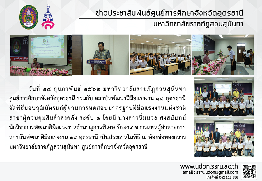 วันที่ 28 กุมภาพันธ์ 2562 มหาวิทยาลัยราชภัฏสวนสุนันทา ศูนย์การศึกษาจังหวัดอุดรธานี ร่วมกับ สถาบันพัฒนาฝีมือแรงงาน 18 อุดรธานี จัดพิธีมอบวุฒิบัตรแก่ผู้ผ่านการทดสอบมาตรฐานฝีมือแรงงานแห่งชาติ สาขาผู้ควบคุมสินค้าคงคลัง ระดับ 1 โดยมี นางสาวนิ่มนวล ศงสนันทน์ นักวิชาการพัฒนาฝีมือแรงงานชำนาญการพิเศษ รักษาราชการแทนผู้อำนวยการสถาบันพัฒนาฝีมือแรงงาน 18 อุดรธานี เป็นประธานในพิธี ณ ห้องช่อทองกวาวมหาวิทยาลัยราชภัฏสวนสุนันทา ศูนย์การศึกษาจังหวัดอุดรธานี