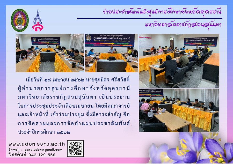 เมื่อวันที่ 18 เมษายน 2562 นายศุภมิตร ศรีสวัสดิ์ ผู้อำนวยการศูนย์การศึกษาจังหวัดอุดรธานี มหาวิทยาลัยราชภัฏสวนสุนันทา เป็นประธานในการประชุมประจำเดือนเมษายน โดยมีคณาจารย์ และเจ้าหน้าที่ เข้าร่วมประชุม ซึ่งมีสาระสำคัญ คือ การติดตามและการจัดทำแผนประชาสัมพันธ์ ประจำปีการศึกษา 2562
