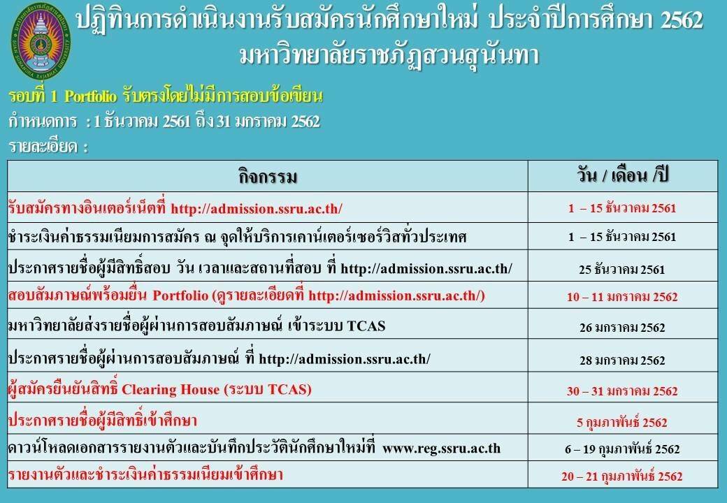 ปฏิทินการดำเนินงานรับสมัครนักศึกษาใหม่ ประจำปีการศึกษา 2562 (รอบที่ 1 Portfolio รับตรงโดยไม่มีการสอบข้อเขียน)
