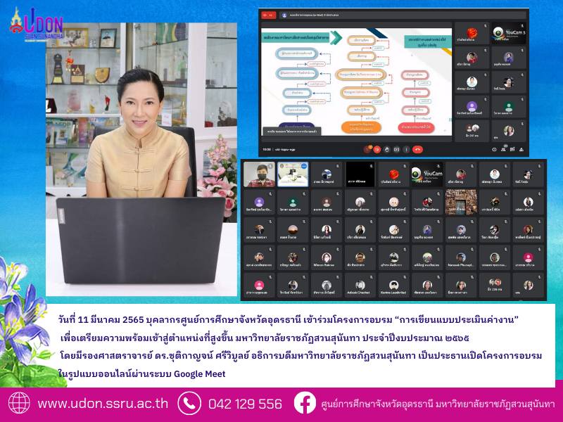 วันที่ 11 มีนาคม 2565 บุคลากรศูนย์การศึกษาจังหวัดอุดรธานี เข้าร่วมโครงการอบรม “การเขียนแบบประเมินค่างาน” เพื่อเตรียมความพร้อมเข้าสู่ตำแหน่งที่สูงขึ้น มหาวิทยาลัยราชภัฏสวนสุนันทา ประจำปีงบประมาณ 2565 โดยมีรองศาสตราจารย์ ดร.ชุติกาญจน์ ศรีวิบูลย์ อธิการบดีมหาวิทยาลัยราชภัฏสวนสุนันทา เป็นประธานเปิดโครงการอบรม ในรูปแบบออนไลน์ผ่านระบบ Google Meet